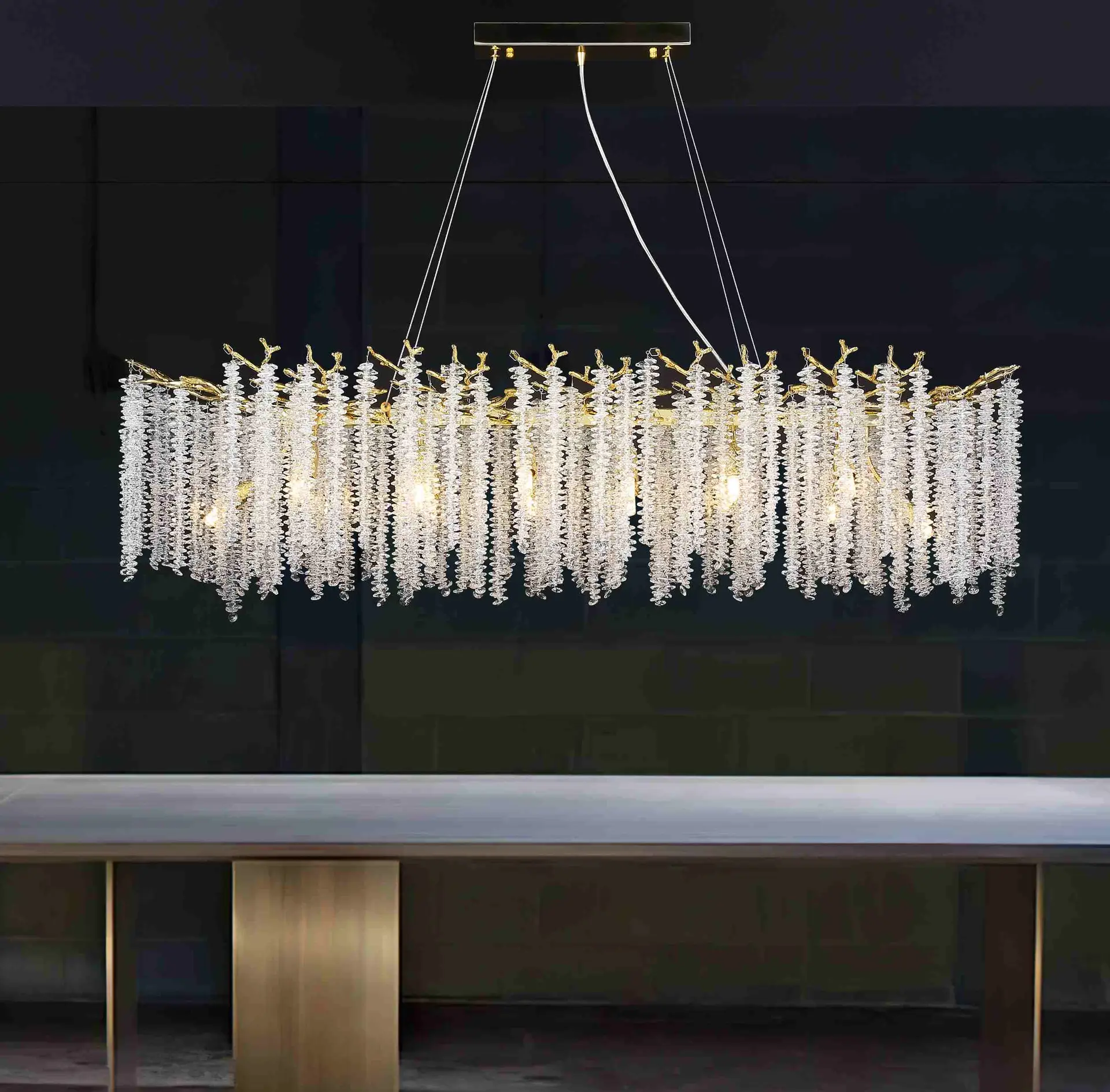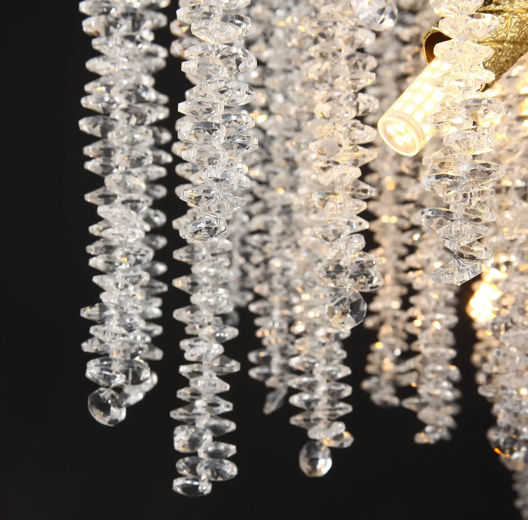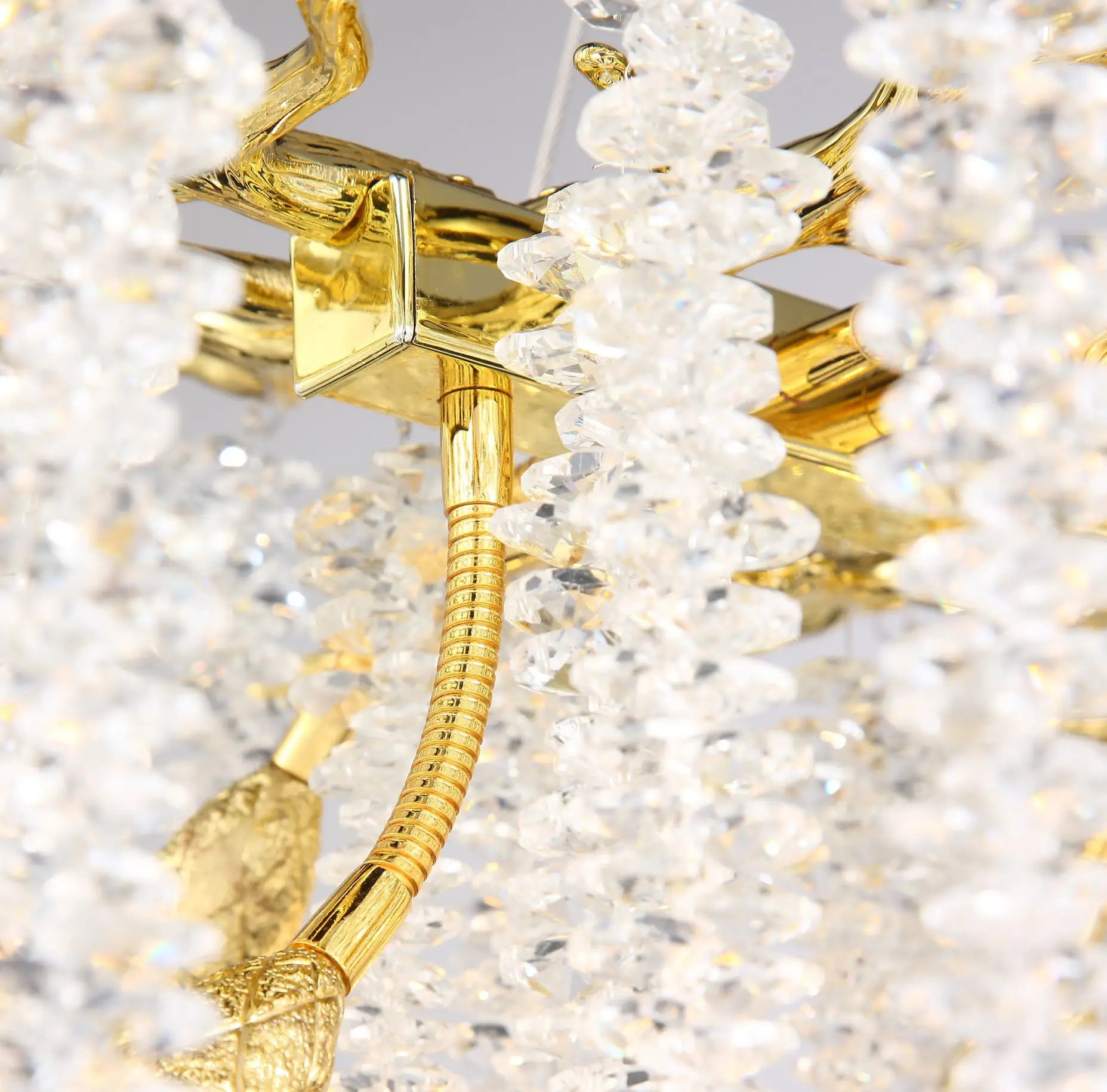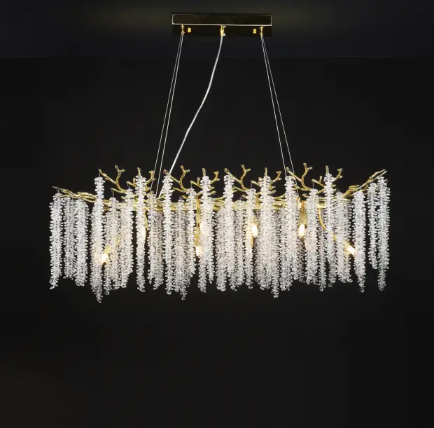 Precision cast metal frame: The main body and branches of the lamp body are made of high-quality precision cast metal (commonly such as environmentally friendly electroplated copper, wrought iron, or stainless steel), with a sturdy and stable structure. The surface is treated with multiple processes (such as matte gold, antique copper, chrome, black, etc.), resulting in a long-lasting and bright color, corrosion and oxidation resistance, perfectly complementing the crystal’s clarity and giving the lamp an elegant or modern artistic line.